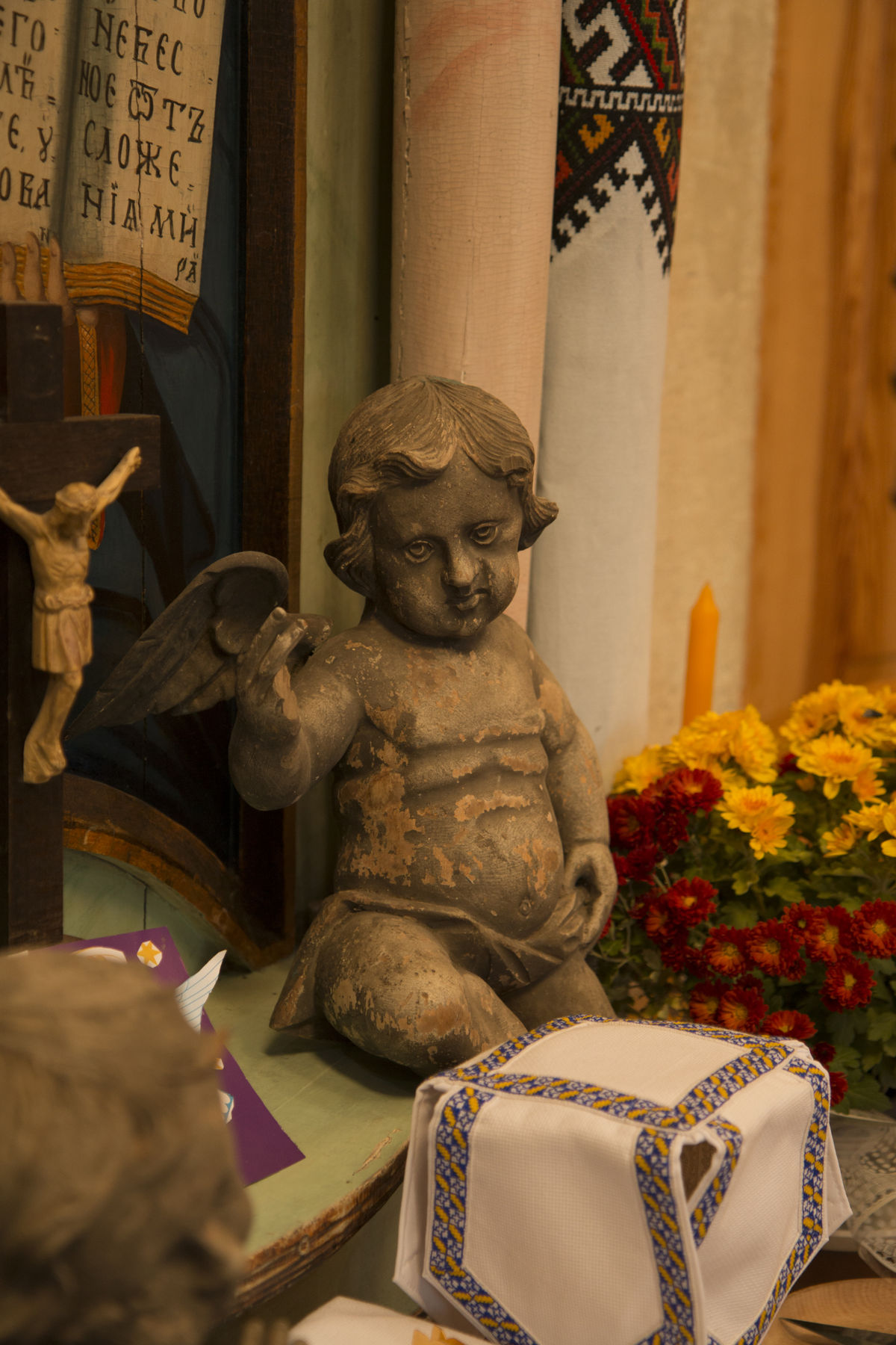 Добродіями було передано ряд старовинних сакральних скульптур, які за різних історичних обставин зазнали пошкоджень та потребують реставрації, зрештою як і сам храм. Одними з таких скульптур є ангели у яких пошкодженні або відсутні частини рук, ніг, а також - крила.