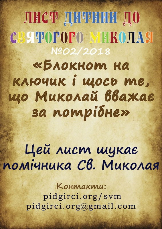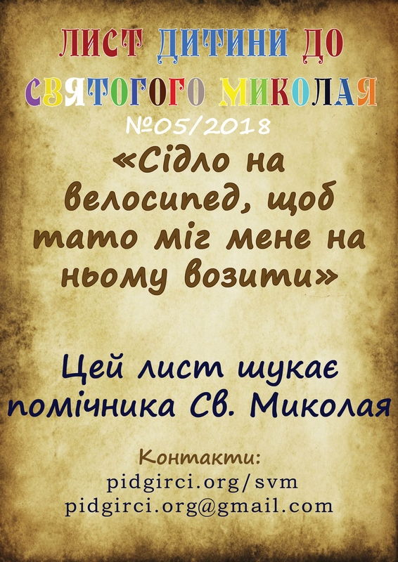 Nota Bene: 1. Ми публікуємо листи актуальність потреби яких нами перевірена. 2. Ми не поширюємо особистої інформації про дитину. 3. Ми категорично проти використання цієї акції добродійства у політичних цілях!