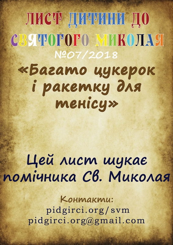 Прошу у Св.Миколая: Багато цукерків і тенісну ракетку .